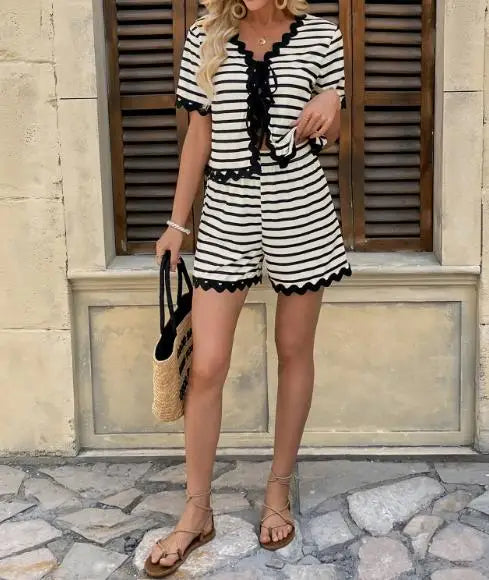 Conjunto Feminino Casual de Verão – Listrado em Patchwork de Renda