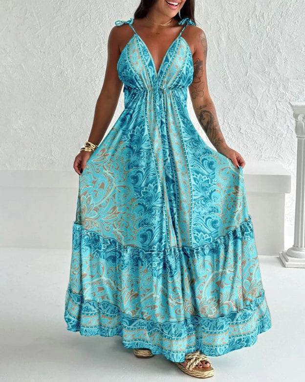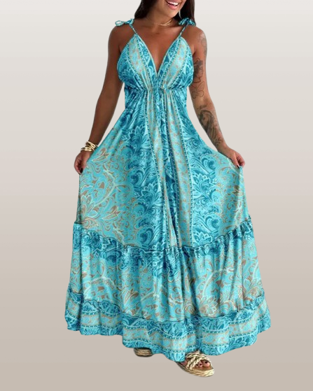 Este vestido longo une uma estampa vibrante com um tecido que parece te abraçar.