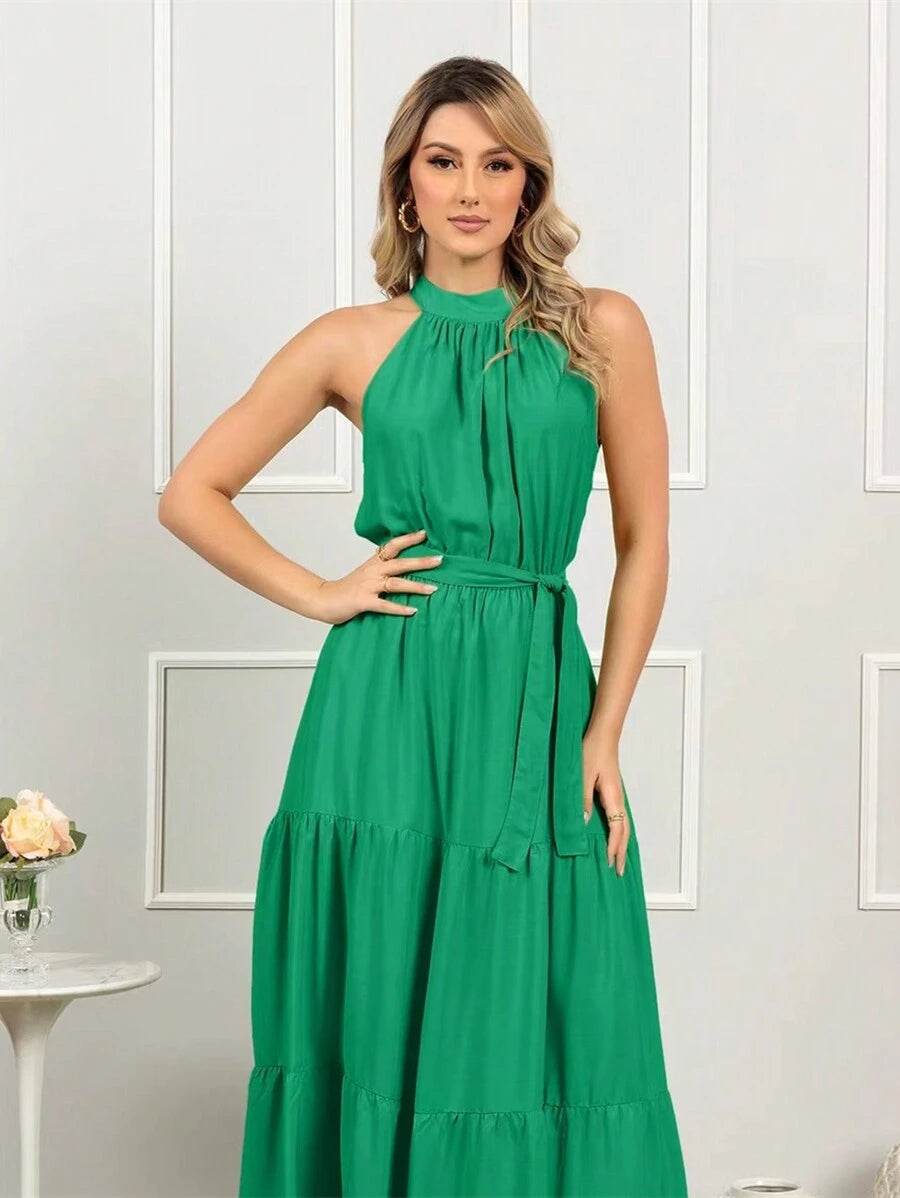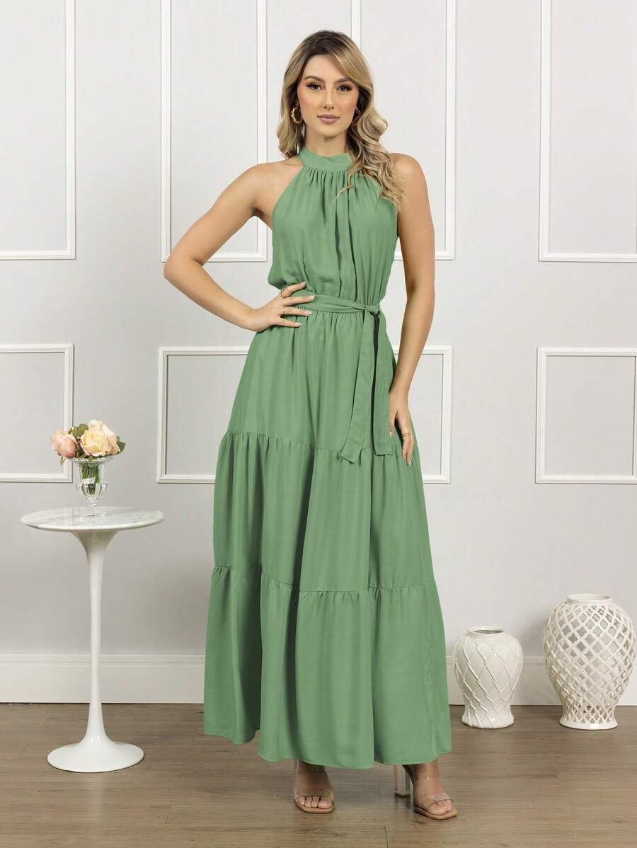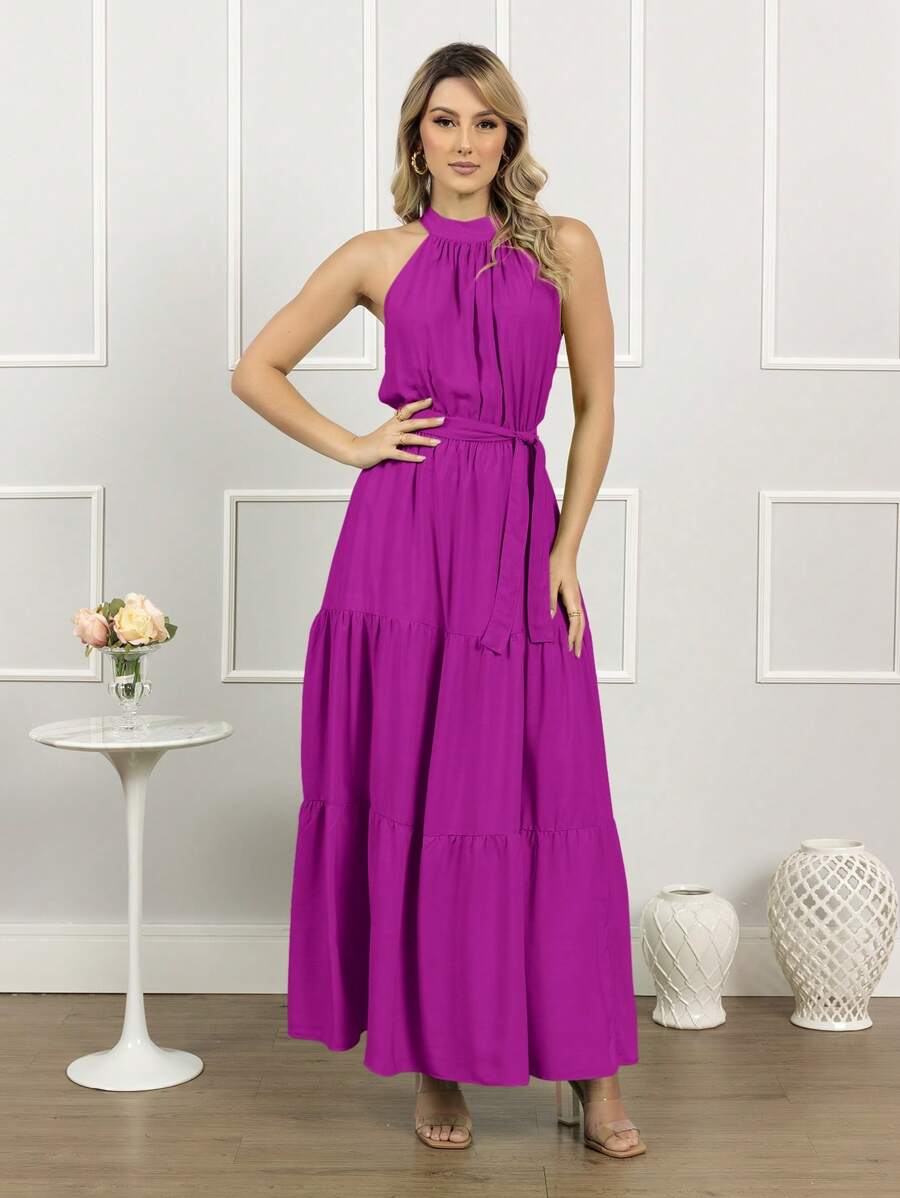 Vestido Feminino Longo Liso Gola Alta Três Maria Com Cinto